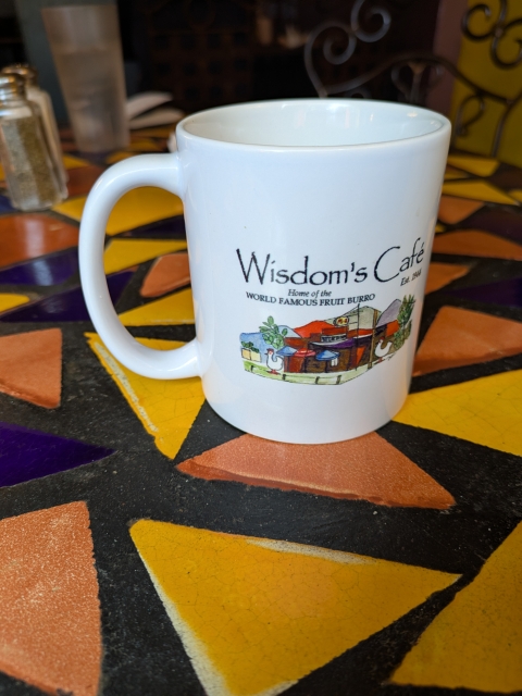 Our last surprise was the best. We stopped at a small Mexican cafe close to Tumacacori, called Wisdom’s Cafe. This being a rather rural area, we didn’t expect much. But we got an excellent lunch. The current owners are the third generation to run the place. The have a desert they call a fruit Burro. It’s a fruit-pie filling in a deep-fried dough (a kind of sweet chimichanga). We selected the lemon-cherry flavor. It came with a huge scoop of ice cream. Ole! I am out of room for coffee cups, but this place absolutely must be acknowledged for it’s superior food and delightful surprises. Maybe I’ll start a virtual coffee cup collection.
