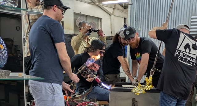 Tucson has a glass blowing studio (natch). Anybody who wants to try their hand can attend classes. This week Kazuki Takizawa gave a short presentation and made a piece. Kazuki suffered from mental health issues. Making glass is a big help in overcoming his problem.