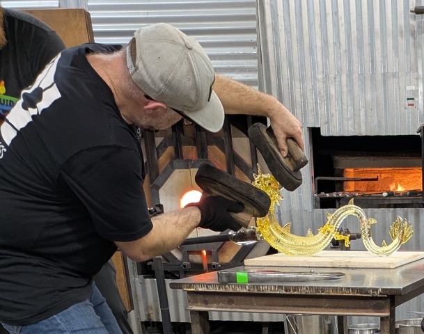 Our second visit to the Sonoran Glass School featured Jason Christian. He made a glass dragon, using local glass blowers to round out his team. It took two hours to make the dragon, but this is misleading. Earlier in the day, he had spent six hours making the head, scales, and other pieces he used in his demonstration. Here you see the glass used to make the body. The actual glass blowing was a very small part of the work. Danita and I finagled seats in the front row. The hot glass was pointed straight at me, which caused a moment’s discomfort. Throughout the process, I was amazed at how precise, careful, and quick the movements were. The smallest mis-step could destroy the work.